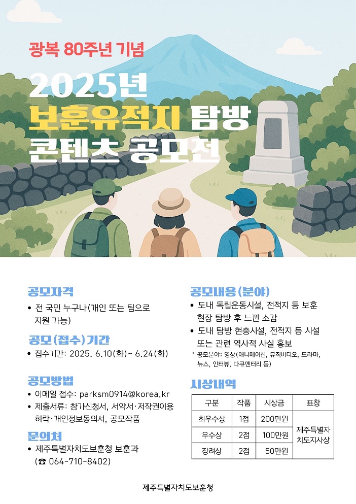 [제주특별자치도보훈청] 「광복 80주년 기념」 2025년 보훈유적지 탐방 콘텐츠 공모전 개최 알림